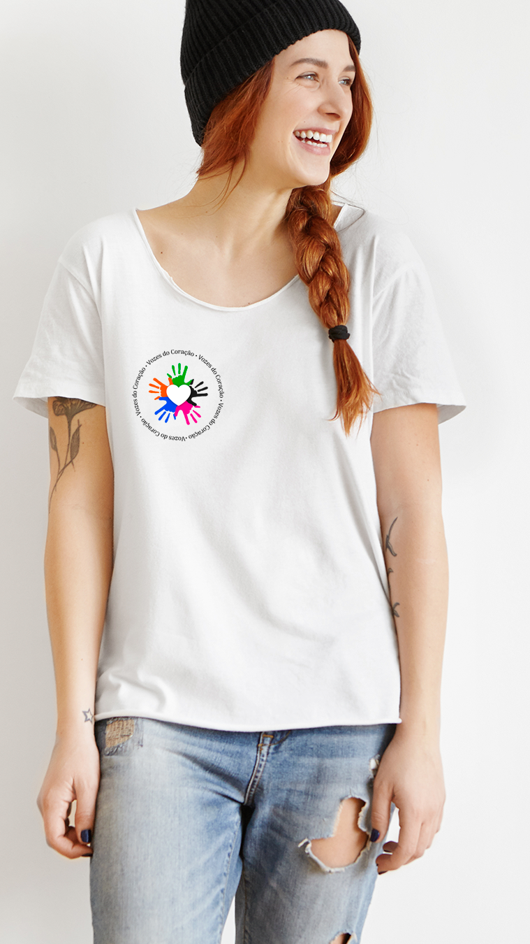 Camiseta branca com logotipo pequeno circular – Vozes do Coração