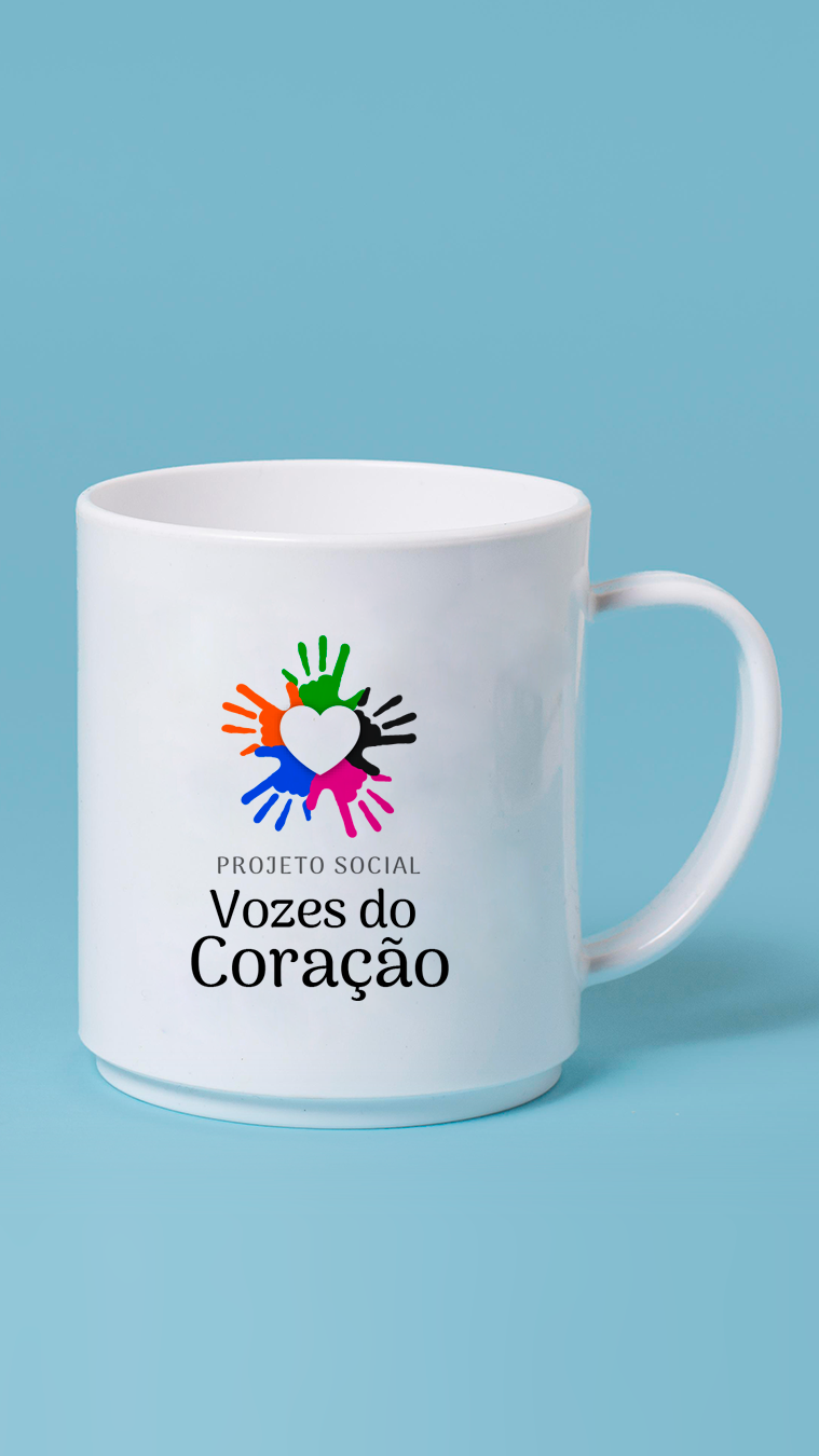 Caneca branca com logotipo pequeno no centro – Vozes do Coração